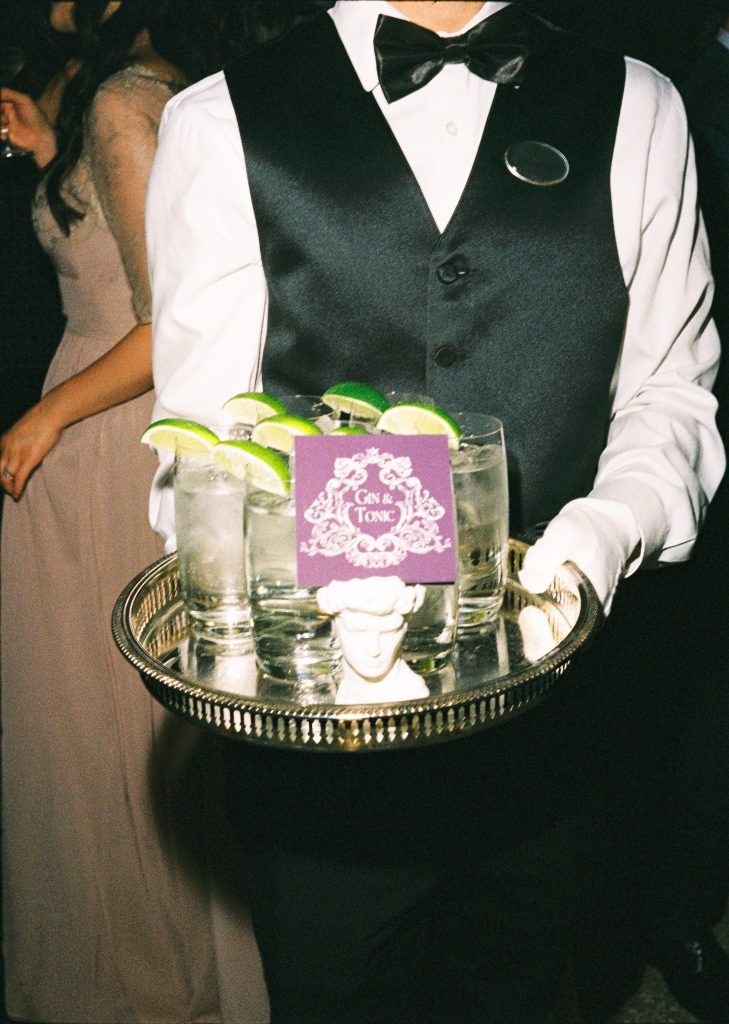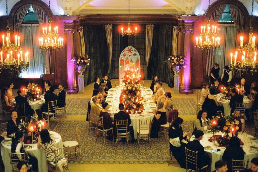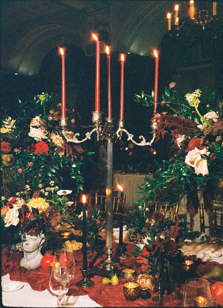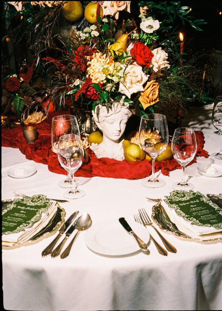 The “Academia Gothic Period” theme came to life through deep burgundy runners, taper candles, silver accents, architectural décor elements, and a layered respect for the old-world. Think: a sophisticated Gothic mood—dramatically elegant.