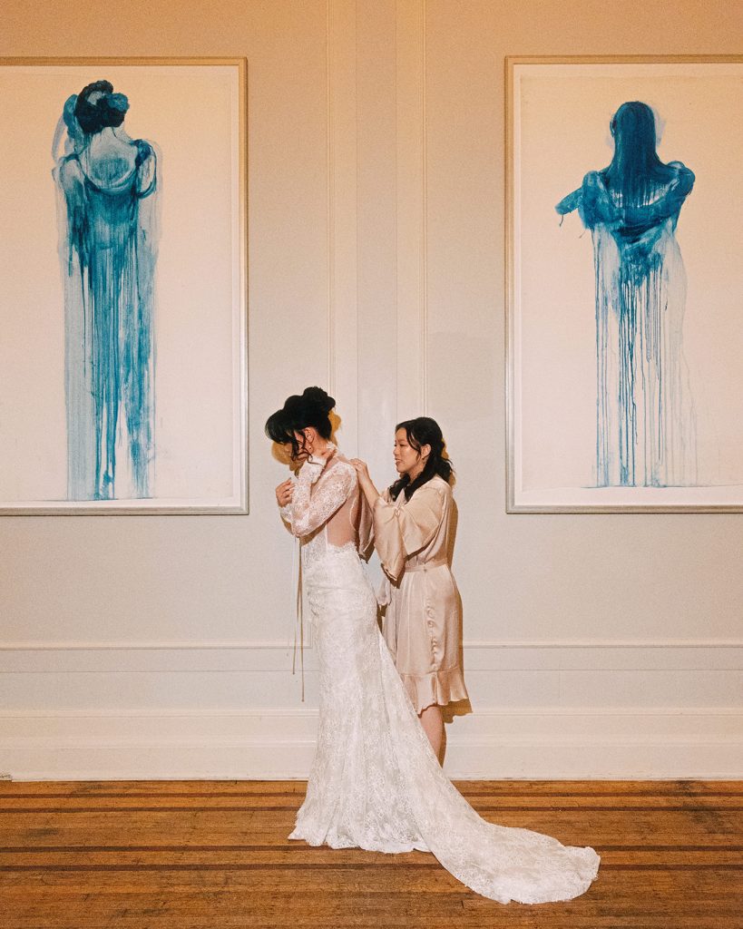 Photography with documentary and editorial creative Tomasz Wagner began with Nora stepping into her dress while Will arrived to settle into the Reading Room to await the First Look.