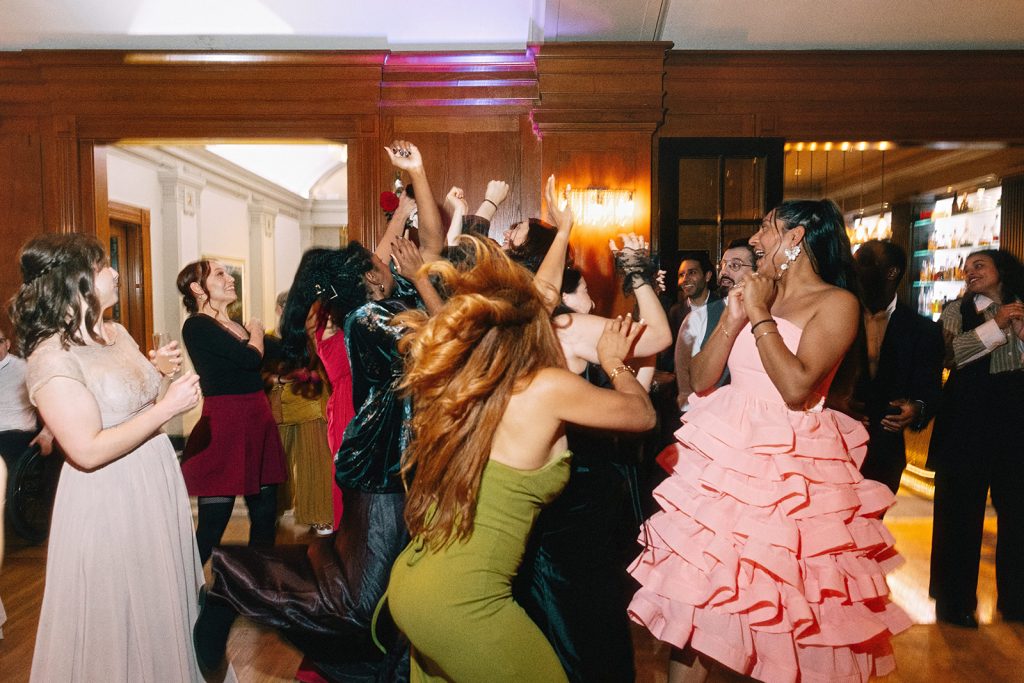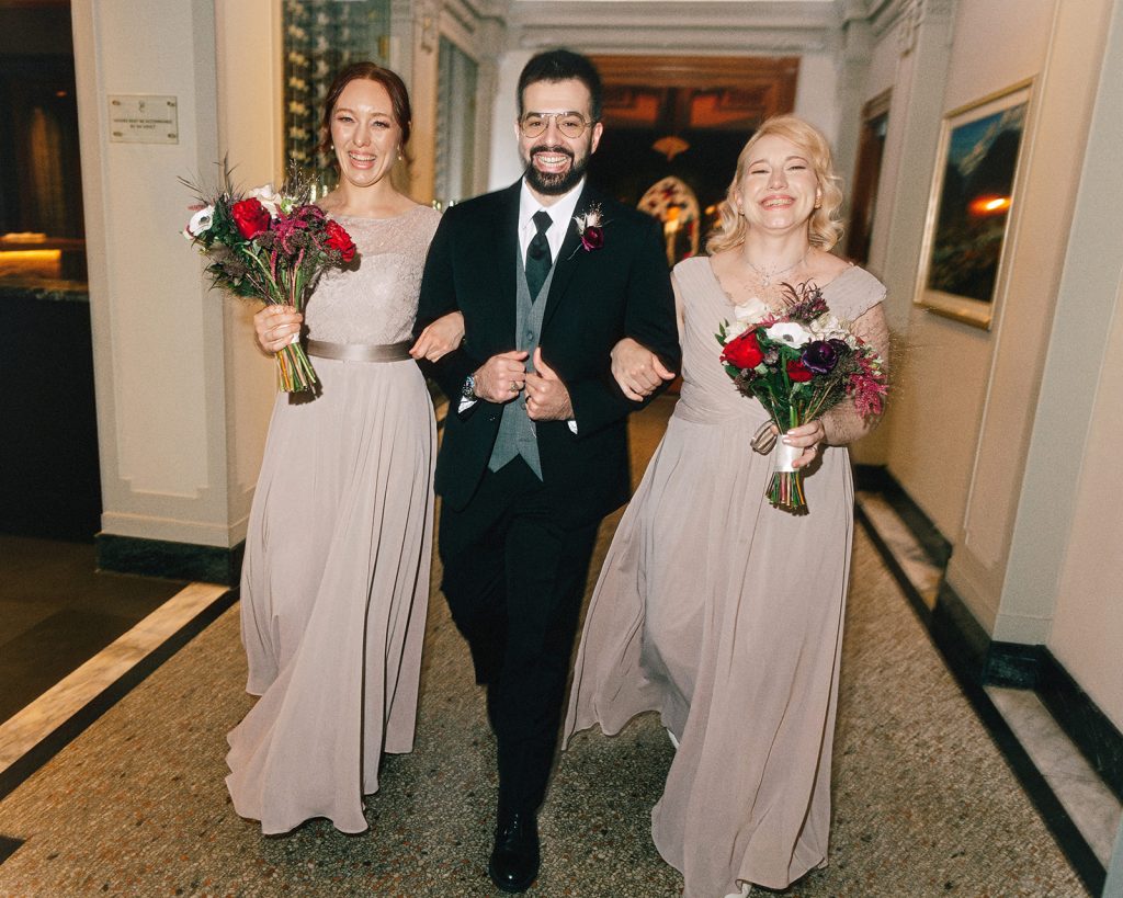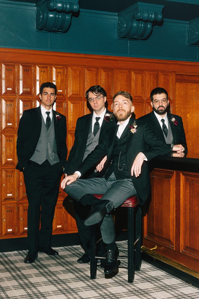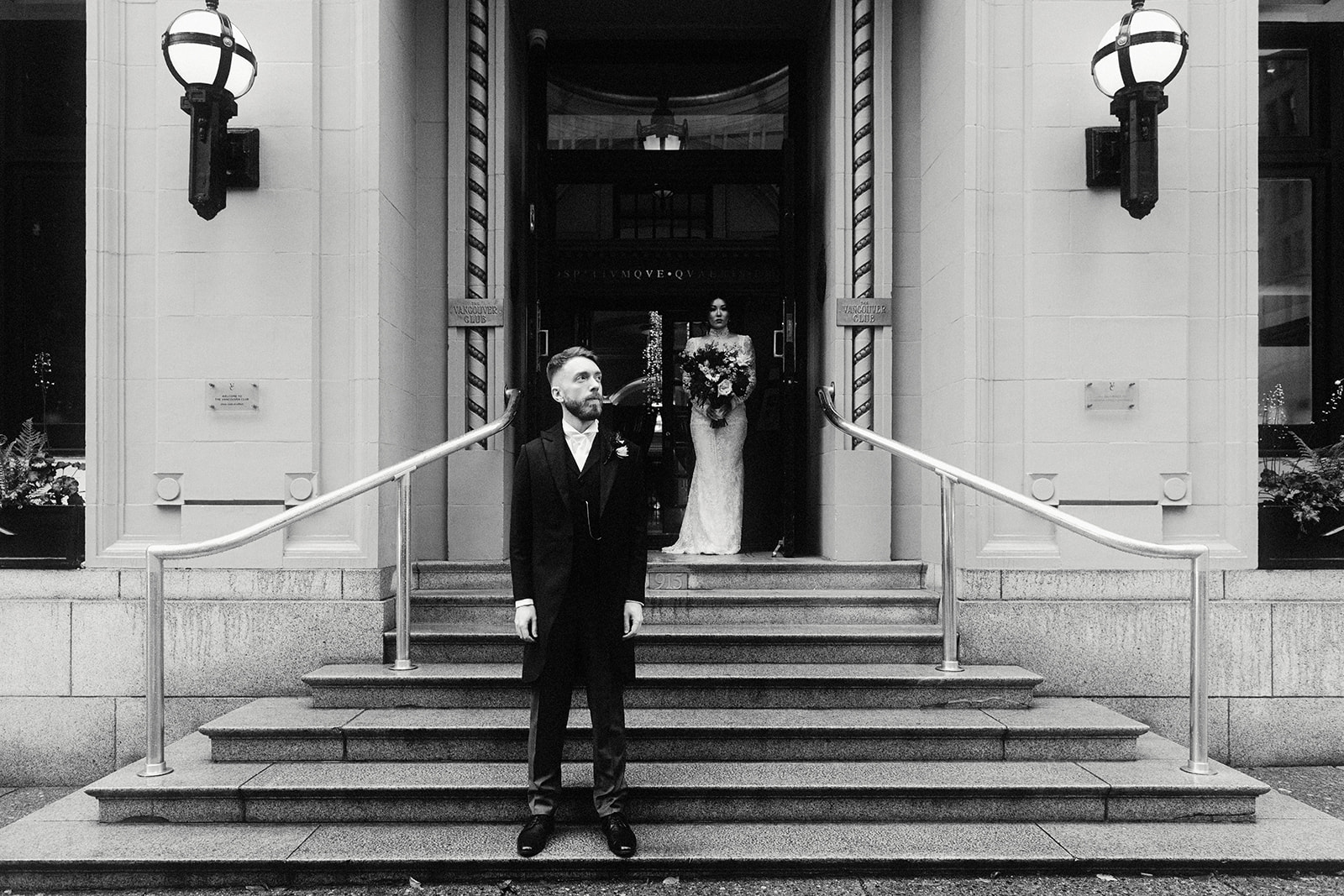 The wedding party joined the festivities and headed around the venue for portraits, leaning into the Vancouver Club’s timeless architecture and old-world ambiance.