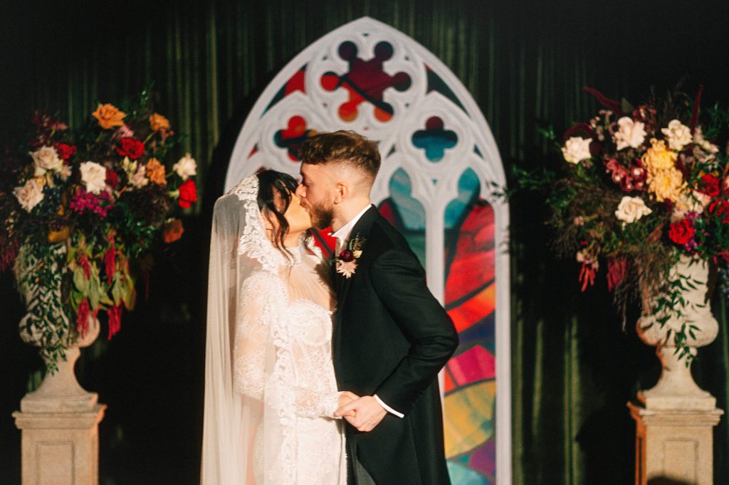 The cathedral window and two stone pillars with florals were moved to the Ballroom alcove to create a dramatic focal point behind the couple for dinner (a true Gothic Academia statement piece).