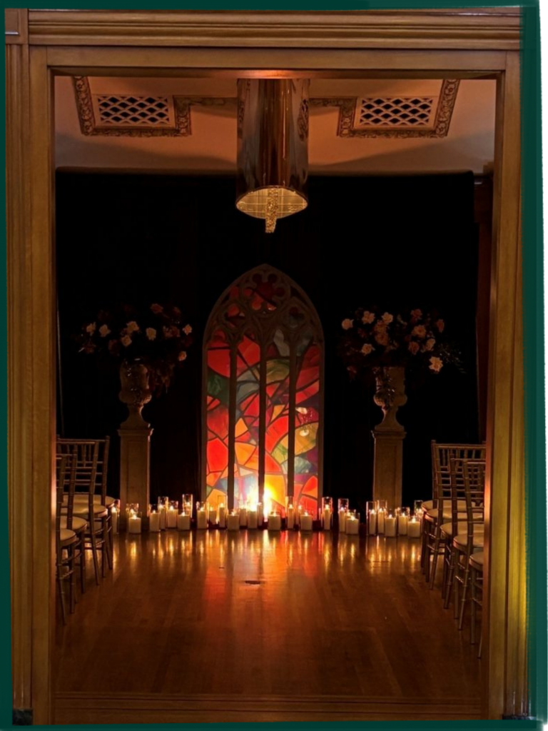 The Custom Cathedral Window… Nora and Will loved the idea of an old world church ceremony, but having decided on a non-religious ceremony they loved the idea of bringing “The Cathedral” to The Vancouver Club. We called on Gordon and team of Unico Print + Media Productions to help make the dream a reality!