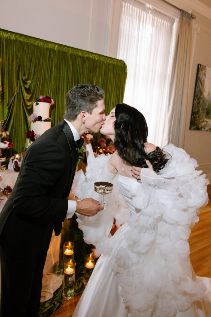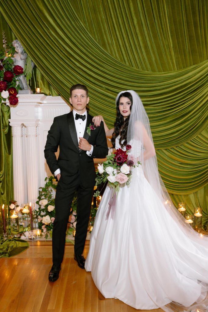 The draperies transformed the space in a way that felt lush, romantic, and deeply immersive. From the dramatic olive velvet backdrop framing the ceremony mantel and dessert display, to the soft gathered fabric moments incorporated throughout, their draperies added movement and warmth, shaping and enhancing the mood of the entire story. It introduced that rich, layered feeling that made the editorial feel both grand and intimate all at once.