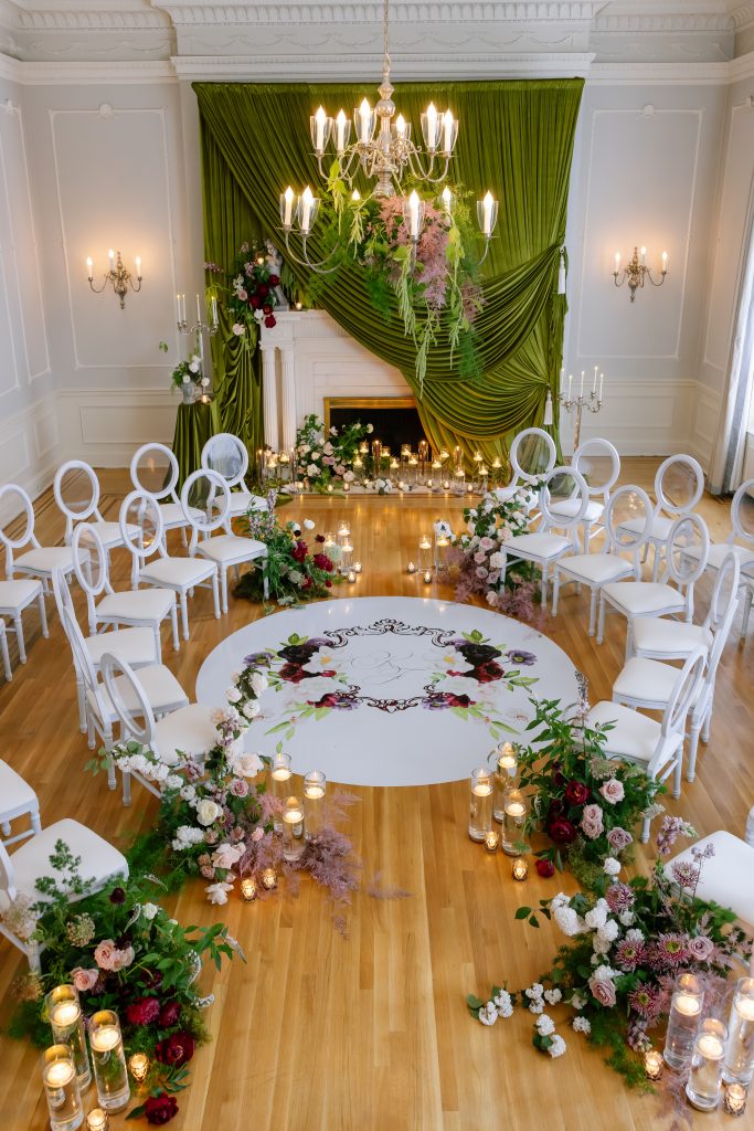 Floral design by Justyna Floral. Custom floral floor wrap by Wrap Guys.