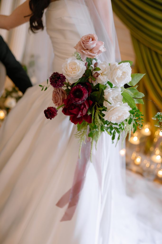 The bouquet in particular was such a statement piece. Against the bride’s soft ivory gown, the florals stood out in rich burgundy, wine, blush, and deep berry tones, accented with fresh green movement and long velvet ribbon. It felt luxurious without being too polished, exactly the right balance for this concept.