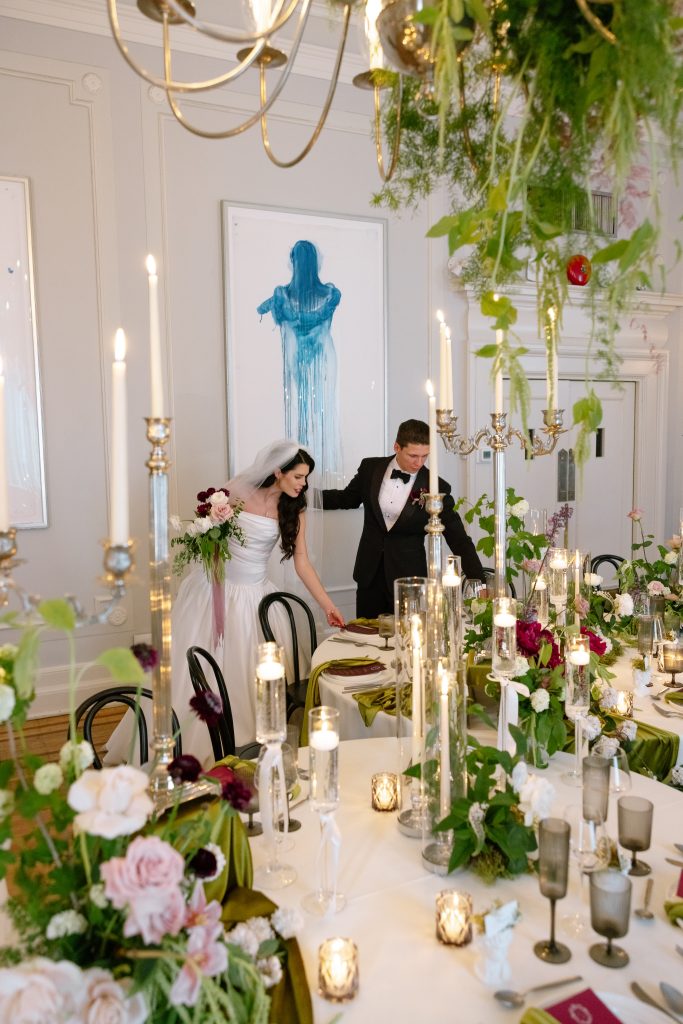 In pure collaborative form, Début Event Design, built a tablescape that was equally elegant and playful— crisp white linens, dinnerware, and glassware set against rich olive textiles, with romantic florals highlighted by polished silver elements — added an unmistakable old-world feel.
