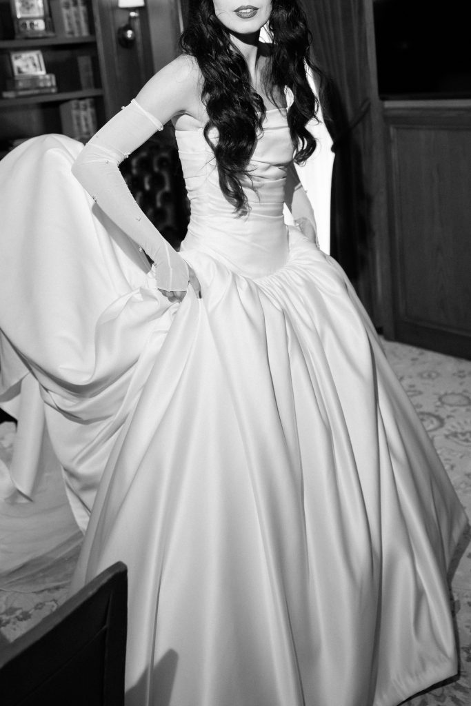 For the late-night fashion moment, TEMPÊTE introduced a more playful, fashion-forward finish with a satin bubble skirt, strapless satin corset, maxi chiffon scarf, baroque pearl necklace, and minimalist mesh gloves. The result felt glamorous and chic, almost as though the couple had slipped away from dinner and into the next chapter of the evening. The sparkling vintage clutch from the DreamGroup collection completed the look beautifully, adding just the right amount of shimmer.